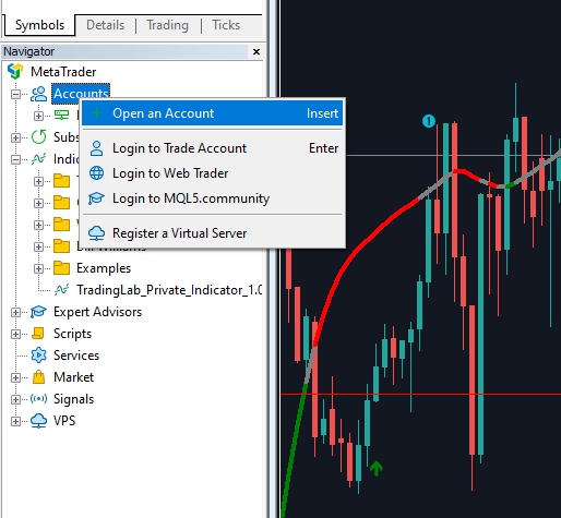 In order to add crypto or stocks to your ticker list, you'll need to open a new broker or connect your current broker to Meta Trader. Go to the Navigator Tool Menu on the left > Right Click "Accounts" > Open an Account.