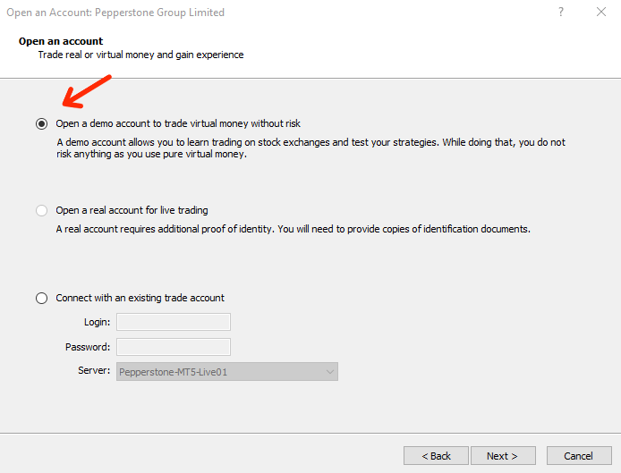 This will pull up a pop-up window. Type in your current crypto or stock broker and see if MT5 allows it. Meta Trader has a huge selection of popular brokers so yours will probably be there.