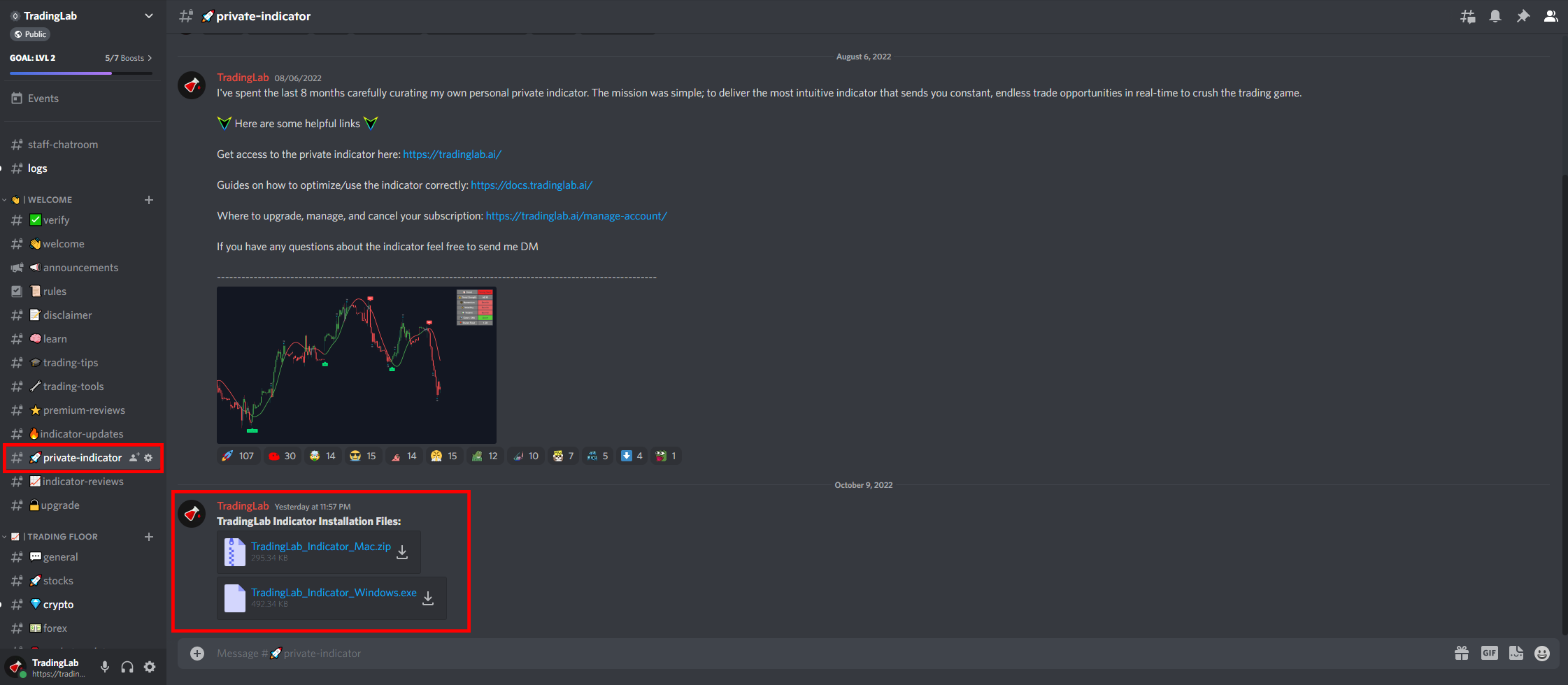 Go to the TradingLab [Discord.](https://discord.com/channels/961751592737067028/1005654418424860802) Once in the Discord, go to the channel called "Private-Indicator". This channel will contain the latest version of the indicator installer. Download that file to your computer.&#x20;
